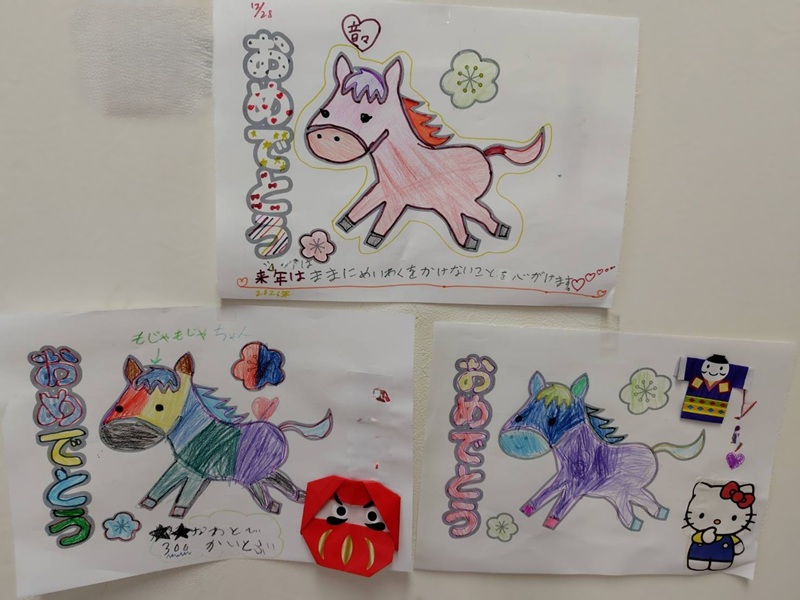 ヘルシーハイム保育園の子供たちが来年の干支「うま」の塗り絵を見せてくれました。みんな思い思いの目標も書いてくれました。カラフルな塗り絵が出来上がりましたね!